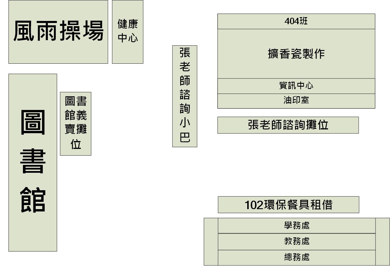 國、高一、二各班級在班上設攤,處室與活動攤位分布如下圖所示。